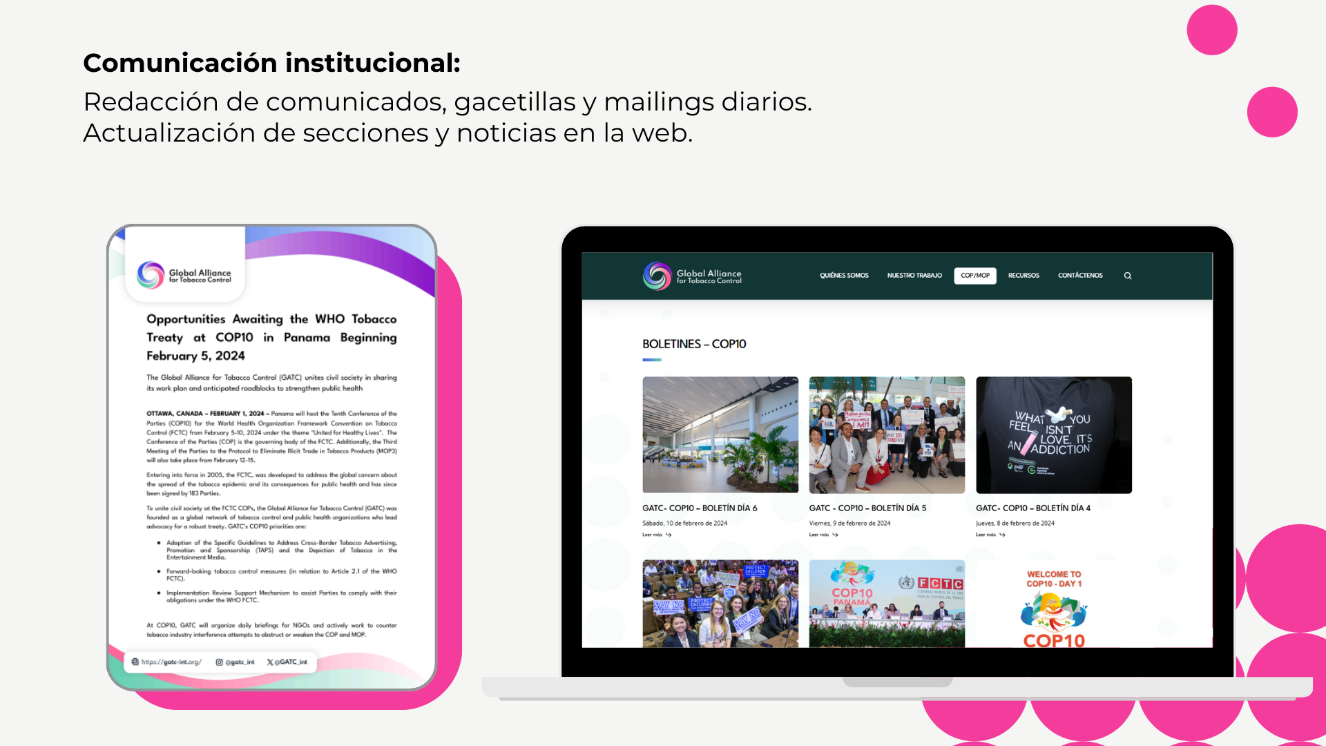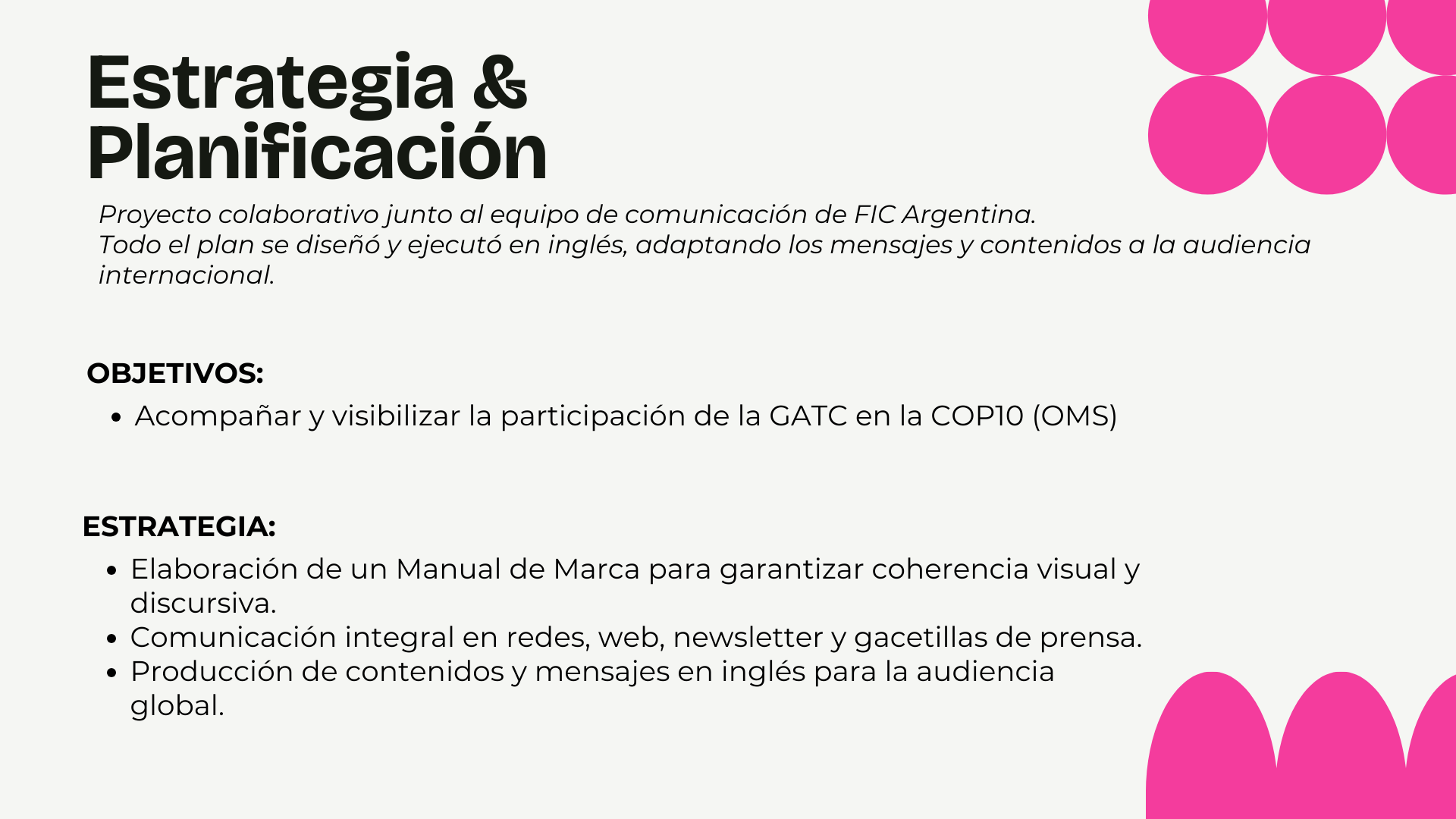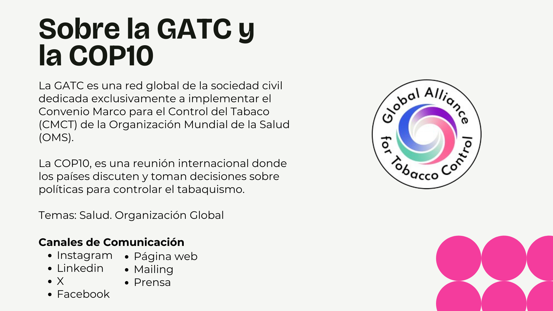 Trabajo junto a FIC Argentina para el desarrollo y ejecución del Plan de Comunicación para la Global Alliance for Tobacco Control (GATC) en el marco de la COP10 del Convenio Marco de la OMS para el Control del Tabaco.