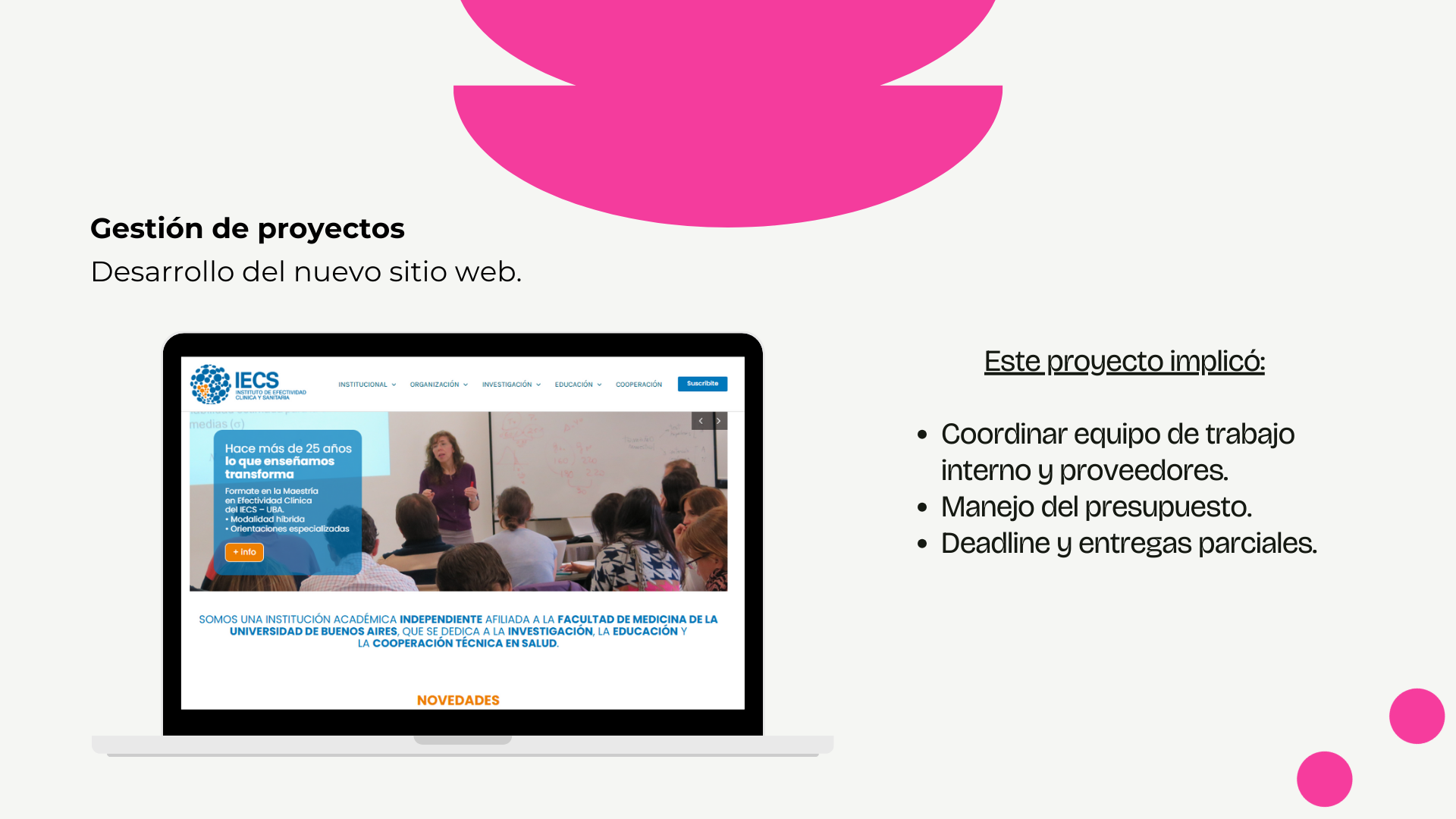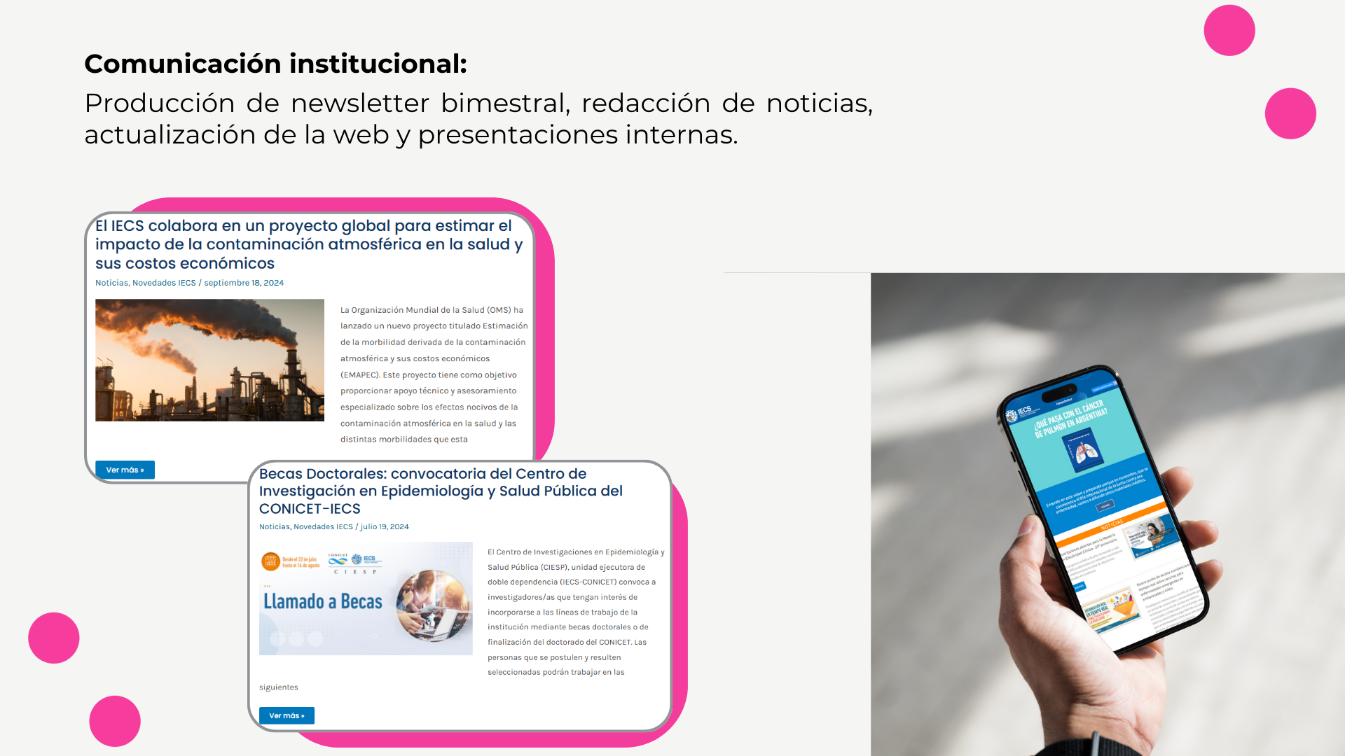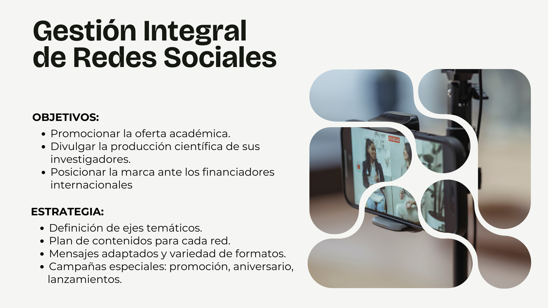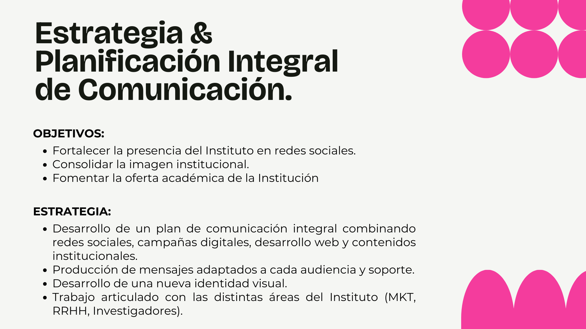 Desarrollo de estrategia de comunicación para sus redes sociales (Instagram, LinkedIn, X y Facebook), con el objetivo de promocionar la oferta académica del Instituto, difundir la producción científica de sus investigadores y posicionar la marca en el ámbito digital. Gestión del proyecto de renovación del sitio web, coordinando tareas, entregas y presupuesto. Desarrollo de un nuevo manual de marca con el objetivo de unificar la identidad visual y asegurar la coherencia de los mensajes en todos los canales.