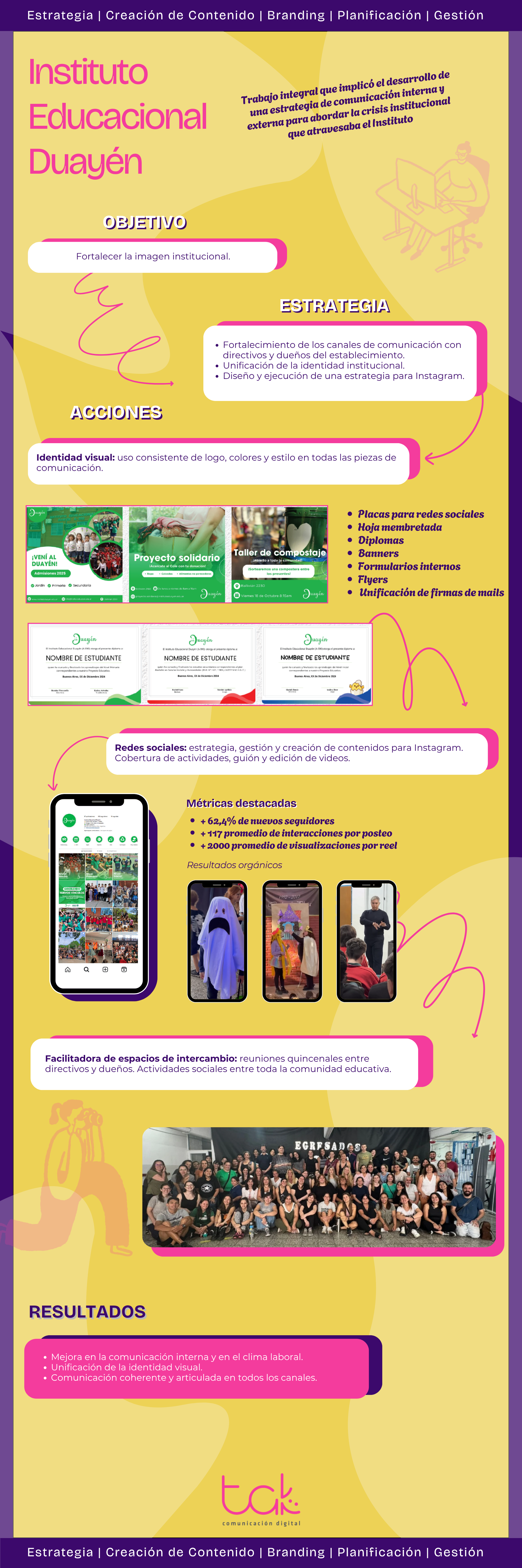 En el Duayén desarrollé un rol integral en comunicación, que incluyó la investigación y el diagnóstico inicial para diseñar una estrategia orientada a fortalecer la imagen institucional, posicionar la presencia del colegio en redes y consolidar el vínculo con la comunidad educativa. También estuve a cargo de la creación de contenidos para Instagram.