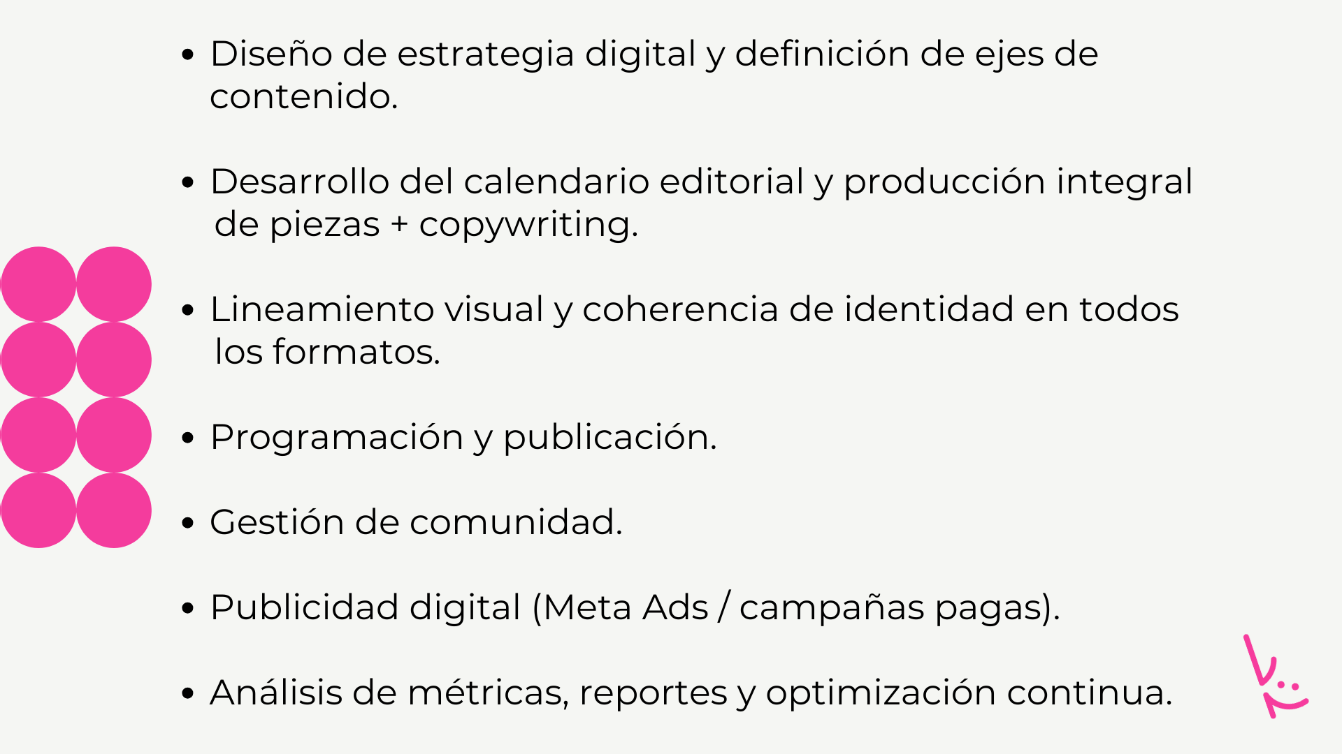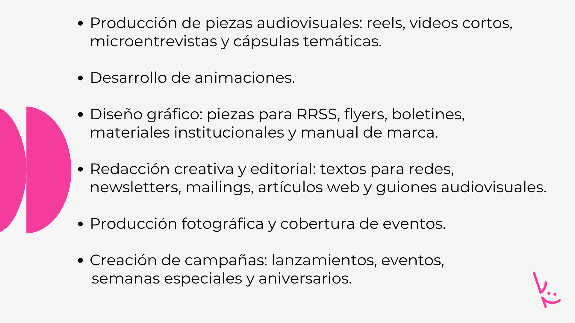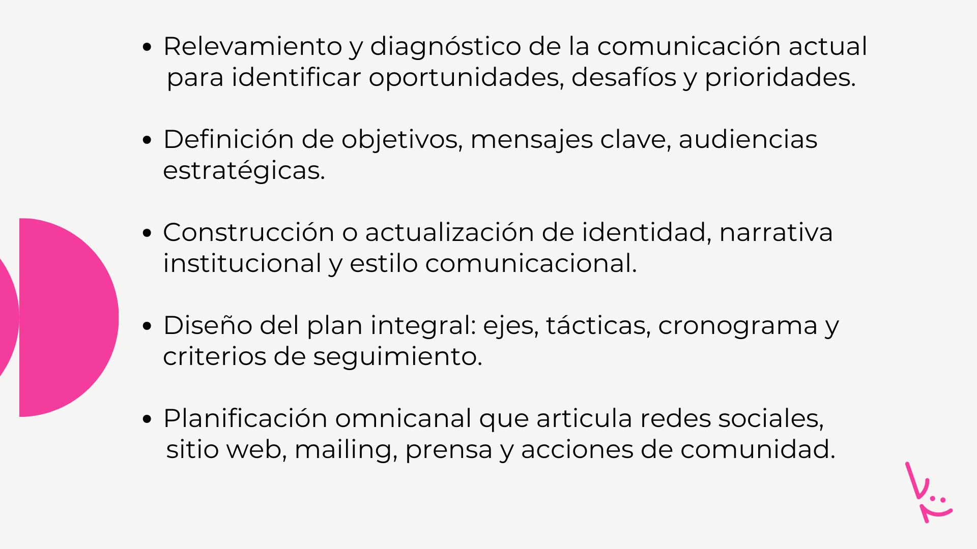 Acompañamos a marcas, instituciones y equipos en la planificación y gestión de su comunicación, ofreciendo asesoramiento estratégico y servicios integrales que combinan análisis, creatividad y resultados.